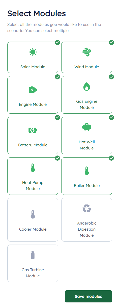 Then select which ones you want and click save modules. If you deselect a module and save, you won’t lose any installations or profit and loss entries you have selected in that module, they simply will be disabled in the model.