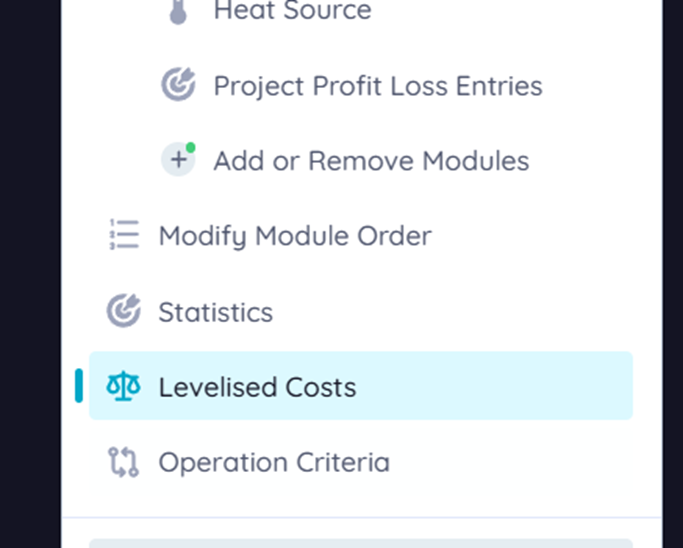 You can find levelised costs on the navigational sidebar, if you don’t have any, click “Create new levelised cost”
