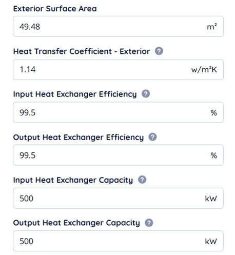 Exterior surface area and heat transfer coefficient determine how much heat is lost; this is a simple thermodynamic model. The heat exchanger efficiency and sizing operate similarly to batteries and limit the amount of input and output the hot well can take and how efficient the exchanger is.