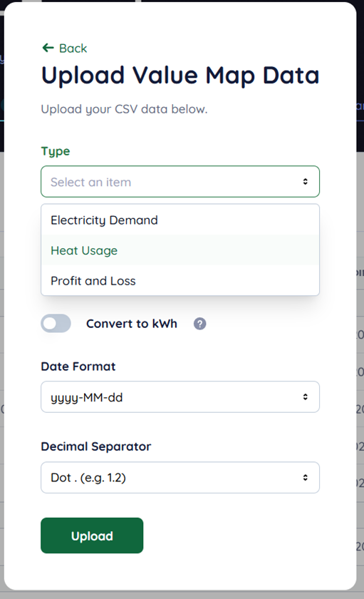 To upload a heat value map, change the type when uploading a csv; the same option appears for the other value map generators.